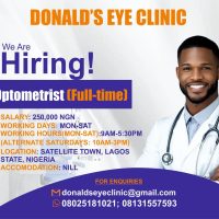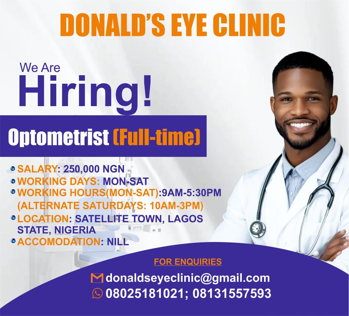 OPTOMETRIST Medical & Pharmaceutical Nigeria April 2, 2026 $181 / month Full Time Application ends: April 30, 2026 Apply Now Please login as "Talent" to apply Job Description Satellite Town, Lagos State Schedule: Mon–Sat (9AM–5:30PM) Alternate Saturdays: 10AM–3PM Share this post Facebook Twitter LinkedIn Photos